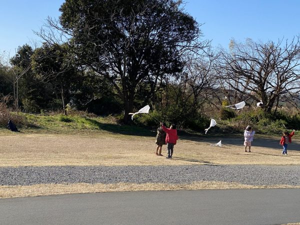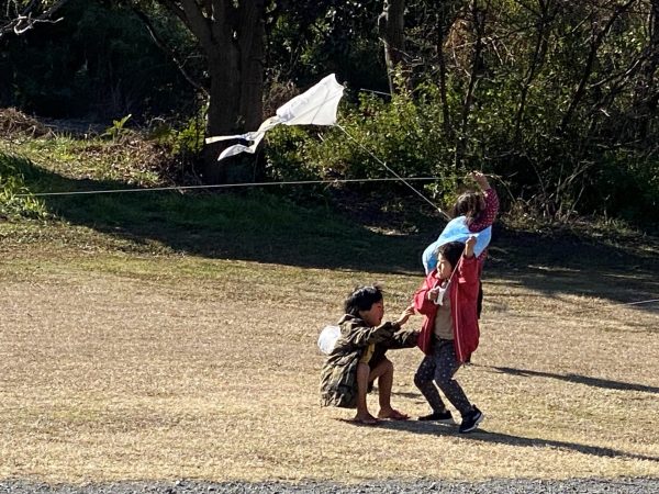 北風の中、高く上がった凧に寒さも忘れ、走り回る子どもたちです。